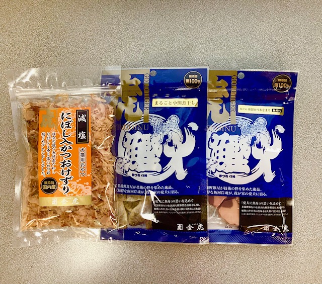 ▼内容 ・【鰹犬】燻製かつおなまり角切り ・【鰹犬】まるごと小鯛煮干し ・【減塩】にぼし入りかつおけずり(犬・猫用)